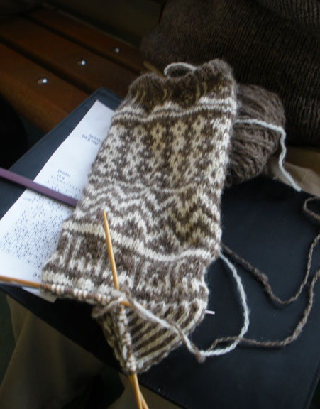 Robin Hansen and the gracious Patty Temple, Long Island's children's librarian, and Christine McDuffie, who escorted us to our next destination. Talk circled around knitting and lambing season. Here's what Christine's working on, a pair of Middle Eastern socks with wool from a fondly remembered sheep, Patrick.